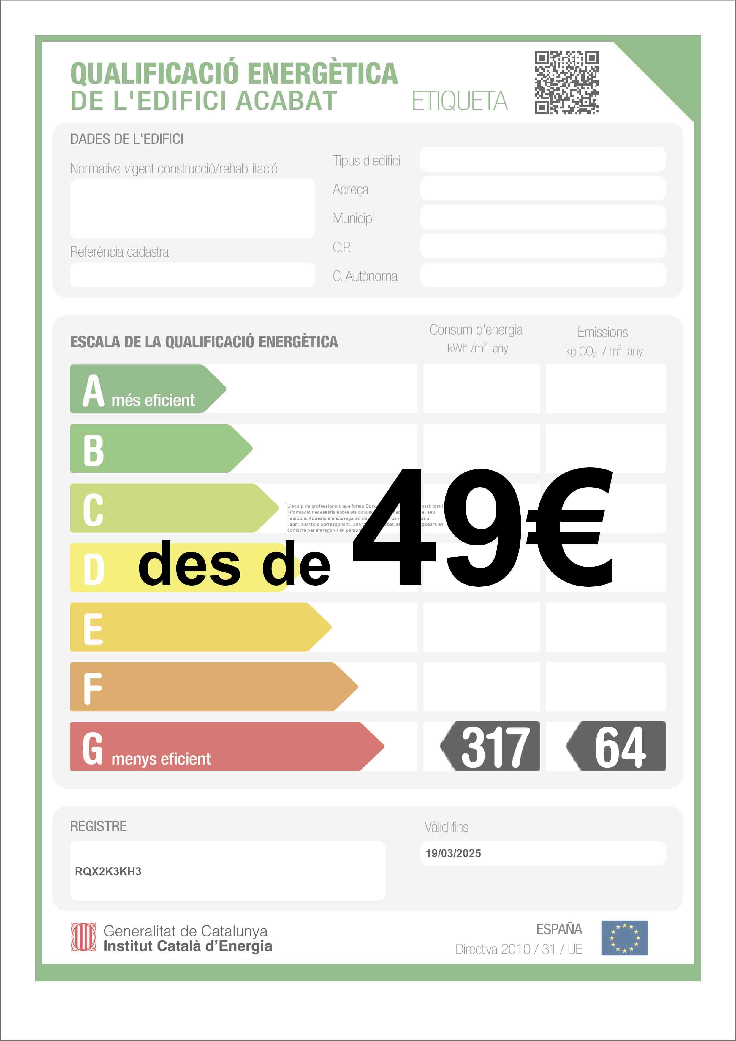 L’etiqueta, obligatòriament, s’inclourà en totes les ofertes, promocions, i publicitat dirigida a la compravenda, o lloguer d’un edifici o part del mateix.
